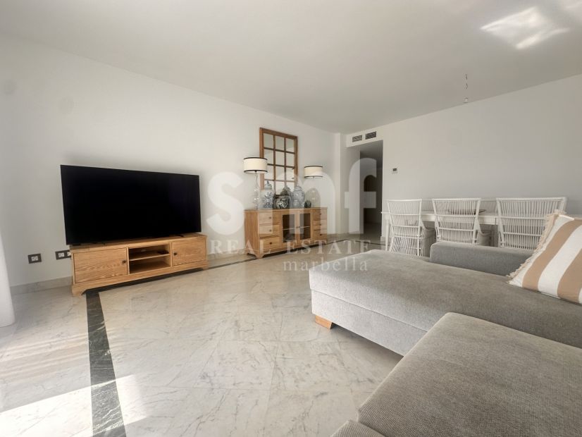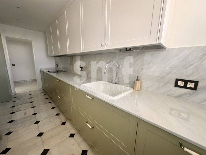 Magnifico apartamento situado en el centro de Puerto Banús,la la Urbanización Marina Banús. Este bonito apartamento se encuentra totalmente reformado, con un estilo muy moderno y luminoso. El apartamento hace esquina, por lo que disfruta de un gran terraza con orientación Sur, Este y Oeste, con sol todo el dia, y vistas abiertas a la piscina de la comunidad, y al mar. Se compone de un gran salón con dos grandes ventanales y salida a la preciosa terraza, dormitorio principal con cuarto de baño en suite, igualmente con salida a la terraza, y dos dormitorios más que comparten un cuarto de baño. La cocina está completamente amueblada y equipada. La urbanización tiene piscina comunitaria, paddle tenis, gimnasio y seguridad 24h plaza de parking en el bajo del edificio.